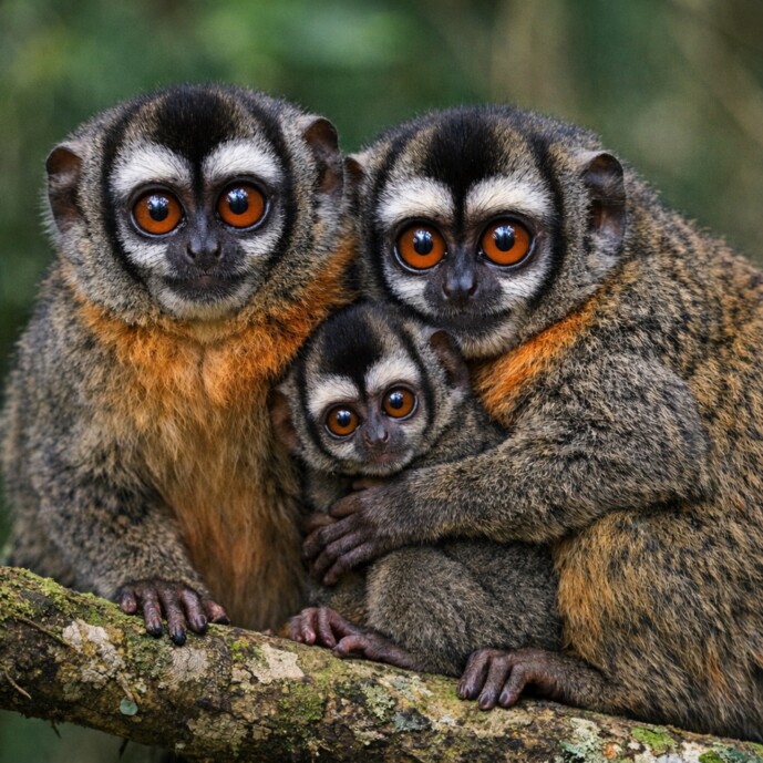 Brumback's night monkeys are the only truly nocturnal monkeys, possessing massive, soulful eyes that lack the reflective layer found in most night-dwellers, forcing them to rely purely on oversized pupils to gather light. These primates are famously monogamous, but the real surprise is their "super-dad" dynamic; fathers perform nearly all the heavy lifting, carrying infants on their backs at all times except during nursing. To navigate their dark canopy homes, they practice "urine washing," where they soak their hands and feet in their own scent to leave a chemical trail for family members. They also communicate through deep, resonant hoots that sound remarkably like owls, and they possess a rare natural resistance to certain strains of malaria, a unique biological trait that distinguishes them from many other New World primates.