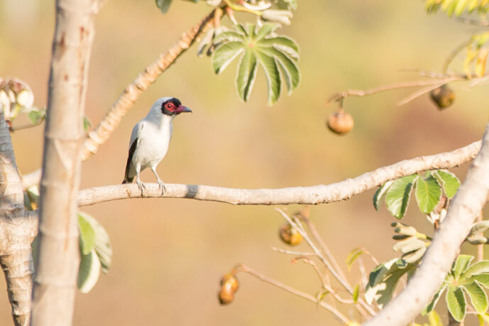 These birds are meticulous renovators that take over old woodpecker holes, where the female vigorously clears out all old debris before lining the cavity with fresh leaves. Instead of a melodic song, they produce a distinctive, frog-like buzzing sound that stands out in the tropical canopy. Despite their medium size, they are fierce territorial defenders and have been observed aggressively chasing away much larger birds. Their most striking adaptation is the bright red, featherless skin surrounding their eyes, which gives them their namesake "masked" appearance and contrasts sharply against their pale plumage.