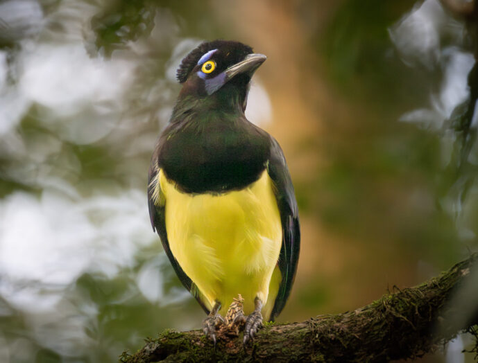 The Plush-crested Jay (*Cyanocorax chrysops*) is a striking and highly intelligent songbird native to the subtropical forests of South America, instantly recognizable by the dense, velvety tuft of short black feathers atop its head that gives the species its name. This medium-sized corvid displays a bold color palette, featuring a deep black face and breast that contrasts sharply with a creamy-white underbelly and vibrant violet-blue wings and tail. Its most arresting feature is its piercing yellow iris, which is beautifully framed by bright blue spots both above and below the eye, lending the bird a look of constant, keen alertness. Beyond its physical beauty, the Plush-crested Jay is known for its remarkable social complexity and vocal mimicry, often traveling in boisterous family groups and utilizing a wide array of calls to communicate within the dense canopy.