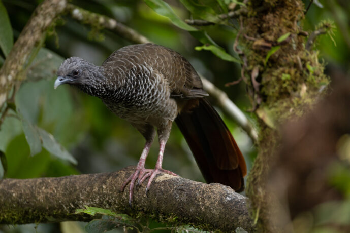 The Colombian Chachalaca features predominantly grayish-brown plumage with a distinctive scaly or speckled pattern of white spots across its neck and breast. Its head is a paler gray, while its long, dark tail is tipped with conspicuous rufous or chestnut on the outer feathers. Pinkish-red legs contrast with its drab, olive-toned body, which provides excellent camouflage within the dense foliage of its native tropical dry forests and scrublands.