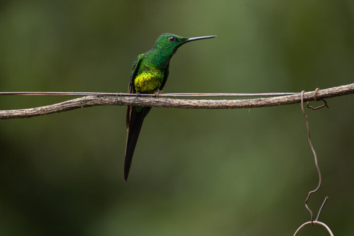 The Empress Brilliant Hummingbird (*Heliodoxa imperatrix*) is a breathtaking inhabitant of the misty cloud forests within the Chocó region of Colombia and Ecuador. Distinguished by its impressive size and exceptionally long, deeply forked tail, this species is a true standout among its smaller relatives. The male is a vision of dark, velvety green, accented by a shimmering emerald throat and a radiant, violet-blue patch at the center of its breast that glitters intensely in the dappled forest light. A unique feature of this "empress" is its foraging behavior; while it is a master of hovering flight, it often prefers to cling to flowers while feeding on nectar, a practical adaptation for navigating the dense, humid canopy. With its elegant proportions and metallic, jewel-toned plumage, the Empress Brilliant remains one of the most striking and regal avian treasures of the tropical Andes.