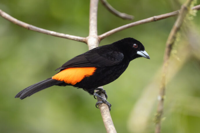 The male Flame-rumped Tanager features velvety jet-black plumage contrasted sharply by a brilliant, fiery scarlet or orange-red lower back and rump. This bold coloration is complemented by a thick, silvery-blue bill with a black tip and deep red eyes. While its dark body provides some cover in deep shadows, the radiant rump serves primarily as a vibrant signal for social and reproductive displays rather than camouflage.