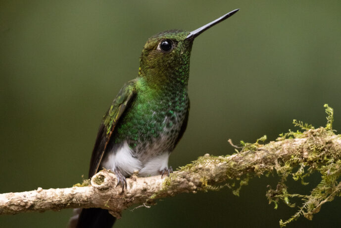The Greenish puffleg is a master of "trap-lining," a foraging strategy where it memorizes a specific circuit of flowers to visit in a precise order rather than defending a single territory. To survive the frequent downpours of the cloud forest, it cleverly builds its nest on the underside of large, drooping leaves, using them as natural umbrellas to keep its chicks dry. Its most iconic feature is the pair of dense, snowy-white "pantaloons"—downy tufts of feathers on its legs that make it look like it is wearing tiny cotton boots. Unlike many of its flashier hummingbird relatives, this bird is uniquely adapted to the dim, shadowy understory, where its subdued olive plumage serves as perfect camouflage while it flits low to the ground.