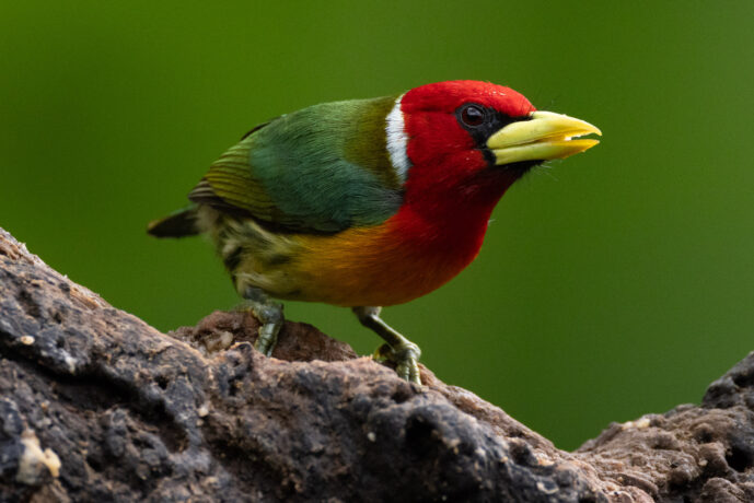 Male red-headed barbets are remarkable forest acrobats, frequently seen hanging completely upside down to pluck berries or snatching insects mid-flight with surprising agility. These birds act as skilled avian architects, using their powerful, chisel-like yellow bills to excavate deep nesting cavities into decaying tree trunks, a behavior that often leads to them being mistaken for woodpeckers. Beyond their solitary work, they are highly social foragers that often lead mixed-species flocks through the canopy. Despite the male's flamboyant crimson plumage, his song is an unexpectedly low-pitched, rhythmic hoot that sounds more like a distant small mammal than a tropical bird.