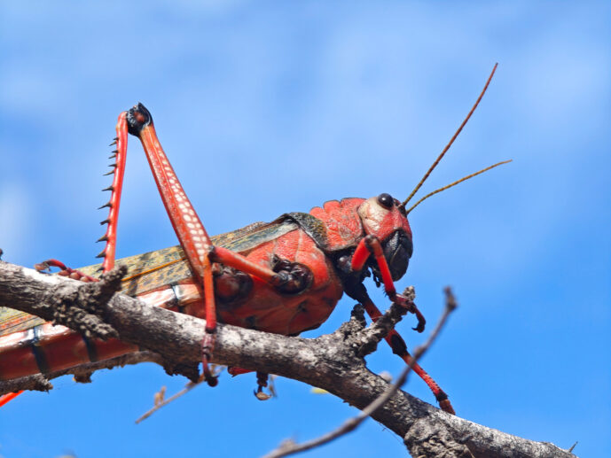 The Red milkweed locust (*Phymateus morbillosus*) is a visually stunning and formidable insect native to Southern Africa, renowned for its large size and vibrant, aposematic coloration. Reaching lengths of up to ten centimeters, this locust displays a brilliant mosaic of red, yellow, and green, which serves as a vivid warning to predators of its high toxicity. Its most striking physical characteristic is a heavily textured, warty thorax that gives it a rugged, prehistoric appearance. As a specialist feeder on toxic milkweed plants, it sequesters harmful cardiac glycosides within its body; when threatened, it can dramatically expel a foul-smelling, noxious foam from specialized thoracic glands. This combination of chemical weaponry and brilliant "stay away" signaling allows the Red milkweed locust to move sluggishly through its habitat with remarkable impunity.