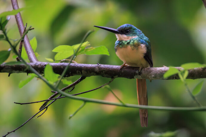 The Rufous-tailed Jacamar (*Galbula ruficauda*) is a dazzling, jewel-like inhabitant of the tropical lowlands of Central and South America, often described as the New World’s ecological equivalent to the bee-eater. This striking bird is characterized by its shimmering, iridescent metallic-green upperparts and a contrasting, deep cinnamon-rufous belly and long tail, all centered around a remarkably elongated, needle-straight black bill. A specialized "sit-and-wait" predator, the jacamar is renowned for its aerial agility, sallying forth from a favorite perch to snatch fast-moving insects—particularly butterflies and dragonflies—with surgical precision before returning to its branch to beat the wings off its prey. Beyond its shimmering plumage, this species possesses the unique habit of excavating its own nesting burrows into earth banks or termite mounds, making it a fascinating blend of avian elegance and specialized predatory skill.