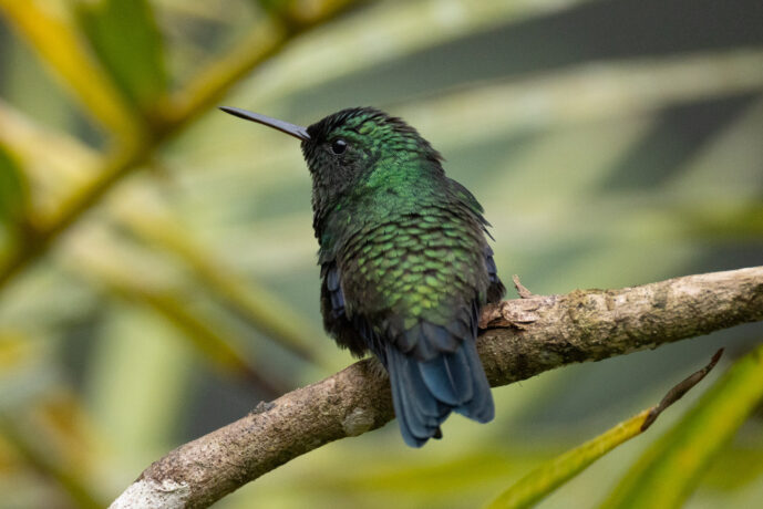 - Key Feature: Brilliant iridescent emerald-green plumage and a straight, entirely black bill