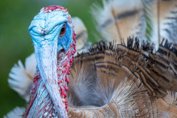 - Key Feature: Iridescent bronze plumage, fan-shaped tail, and fleshy facial caruncles including the snood and wattle