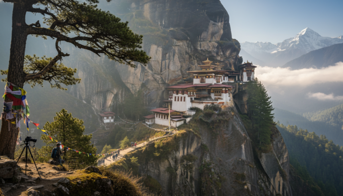 - Paro Taktsang (Tiger’s Nest Monastery): The quintessential image of Bhutan, this monastery clings impossibly to a cliffside. The hike up offers several viewpoints. The first, a cafeteria viewpoint, provides a classic, full-frontal shot. A second, higher viewpoint brings you closer and offers a more angled perspective. Morning light is ideal, as it illuminates the monastery’s face directly. In the late afternoon, the sun moves behind the cliff, creating dramatic silhouettes and rim lighting.