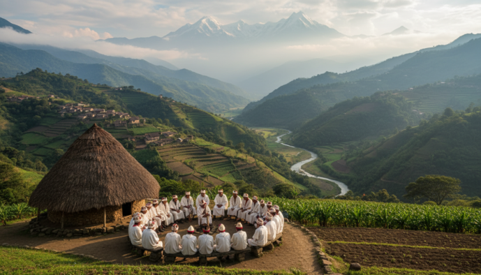 High in the isolated peaks of the Sierra Nevada de Santa Marta, a mountain range they consider the “Heart of the World,” live the Kogi people. They see themselves as the “Elder Brothers,” the guardians of planetary balance, believing that their spiritual work is essential for the health of all humanity—the “Younger Brothers.” Their cosmovision is a complex philosophy centered on “Aluna,” the spiritual and material source of all reality.