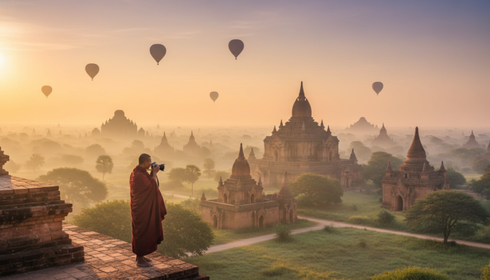 - Sense of Scale: The temples of Bagan and the pagodas of Mandalay are immense. To convey their grandeur, include a human element. A lone monk in a crimson robe walking through a vast temple courtyard or a local farmer cycling past an ancient stupa provides a crucial sense of scale and adds a narrative layer.
